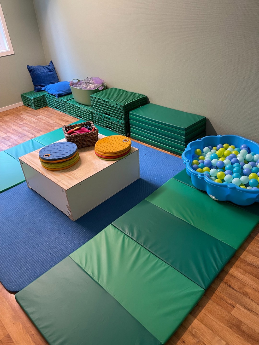 Vi bruker avdelingen vår og lager en løype som stimulerer barna fysisk og motorisk. Vi kan låne utstyr fra gymsalen, blant annet «balansebro» og sklie.
